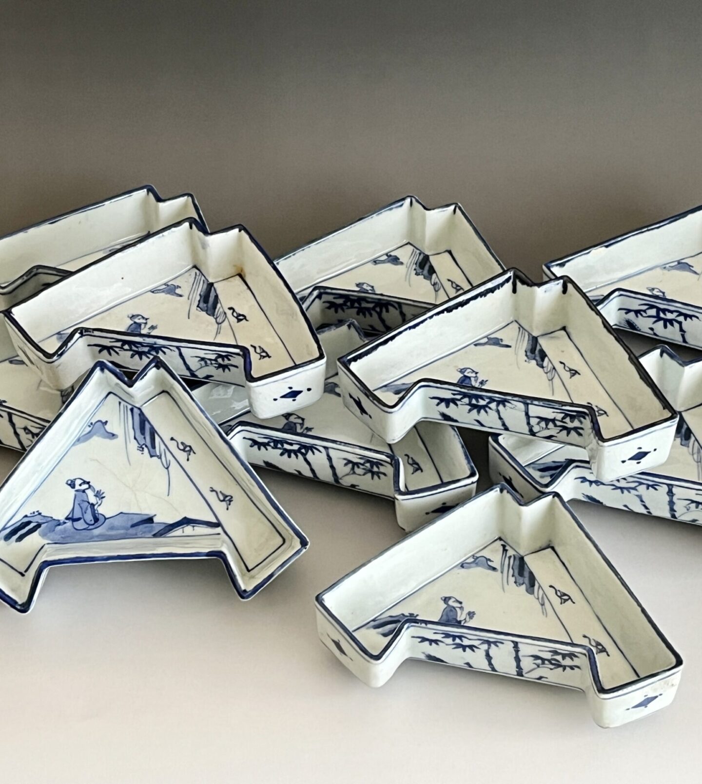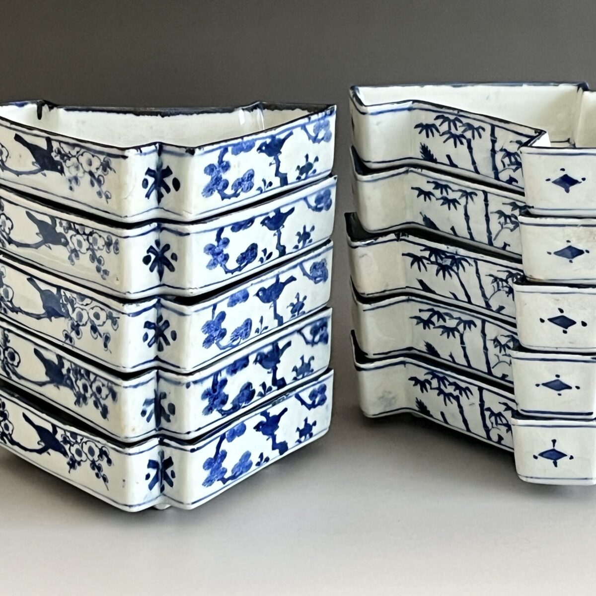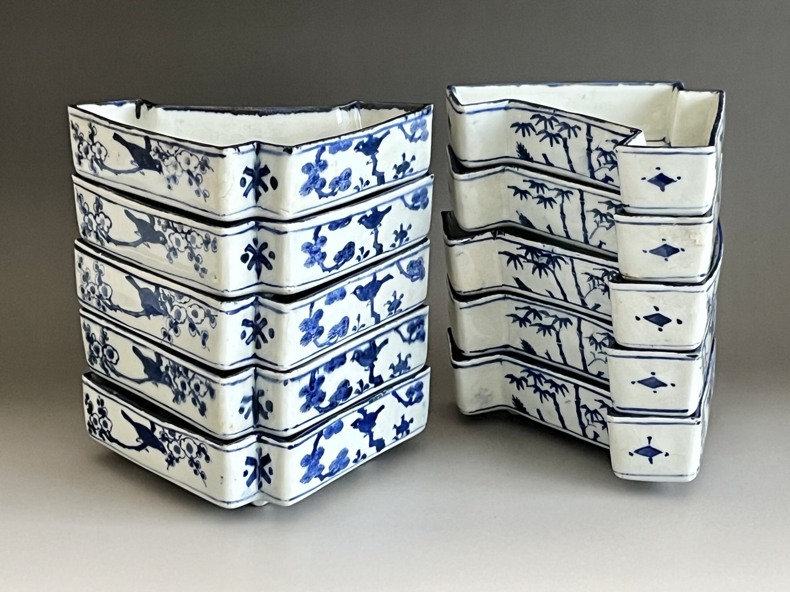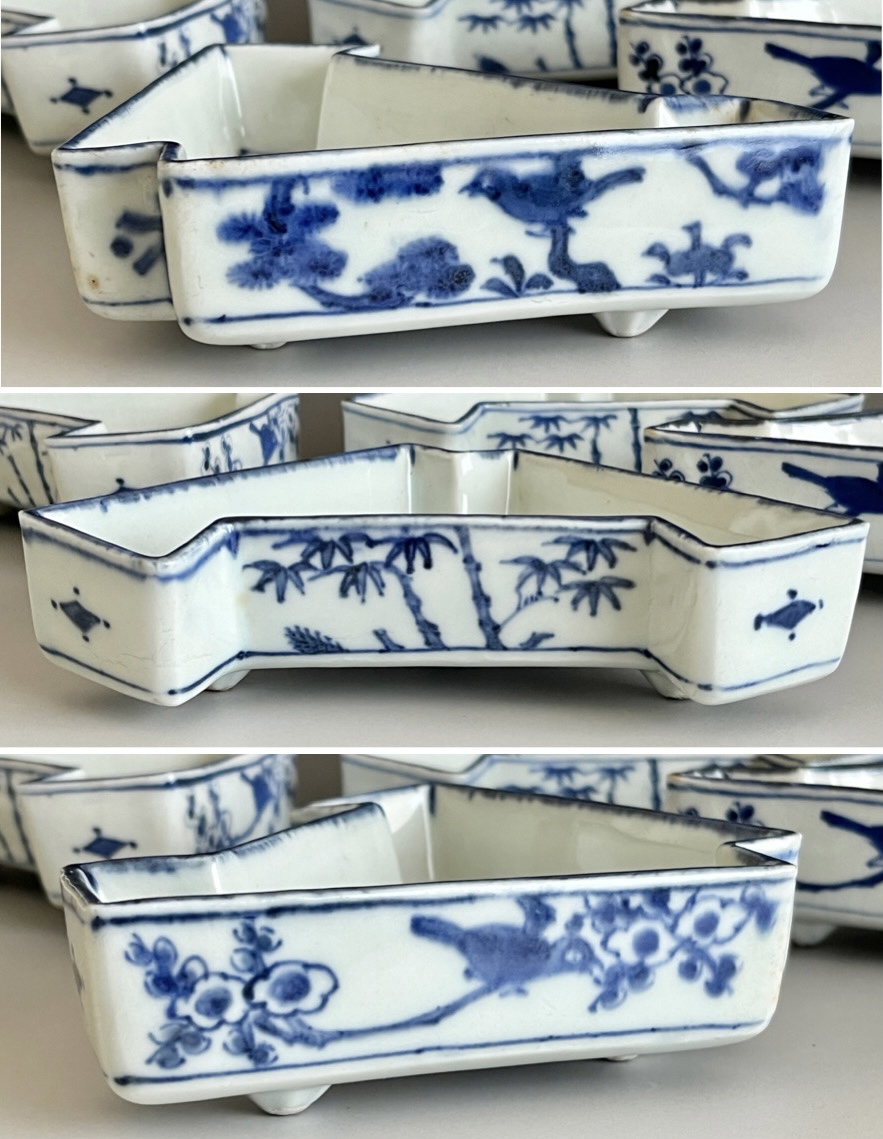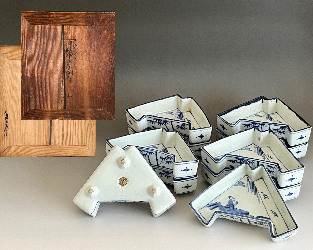 ⚫︎ 十一代 永楽善五郎 (保全) 河濱支流印 染付写 松竹梅紋 結章向付 十客 足付き銘々皿 懐石 会席 和食器の陶印
