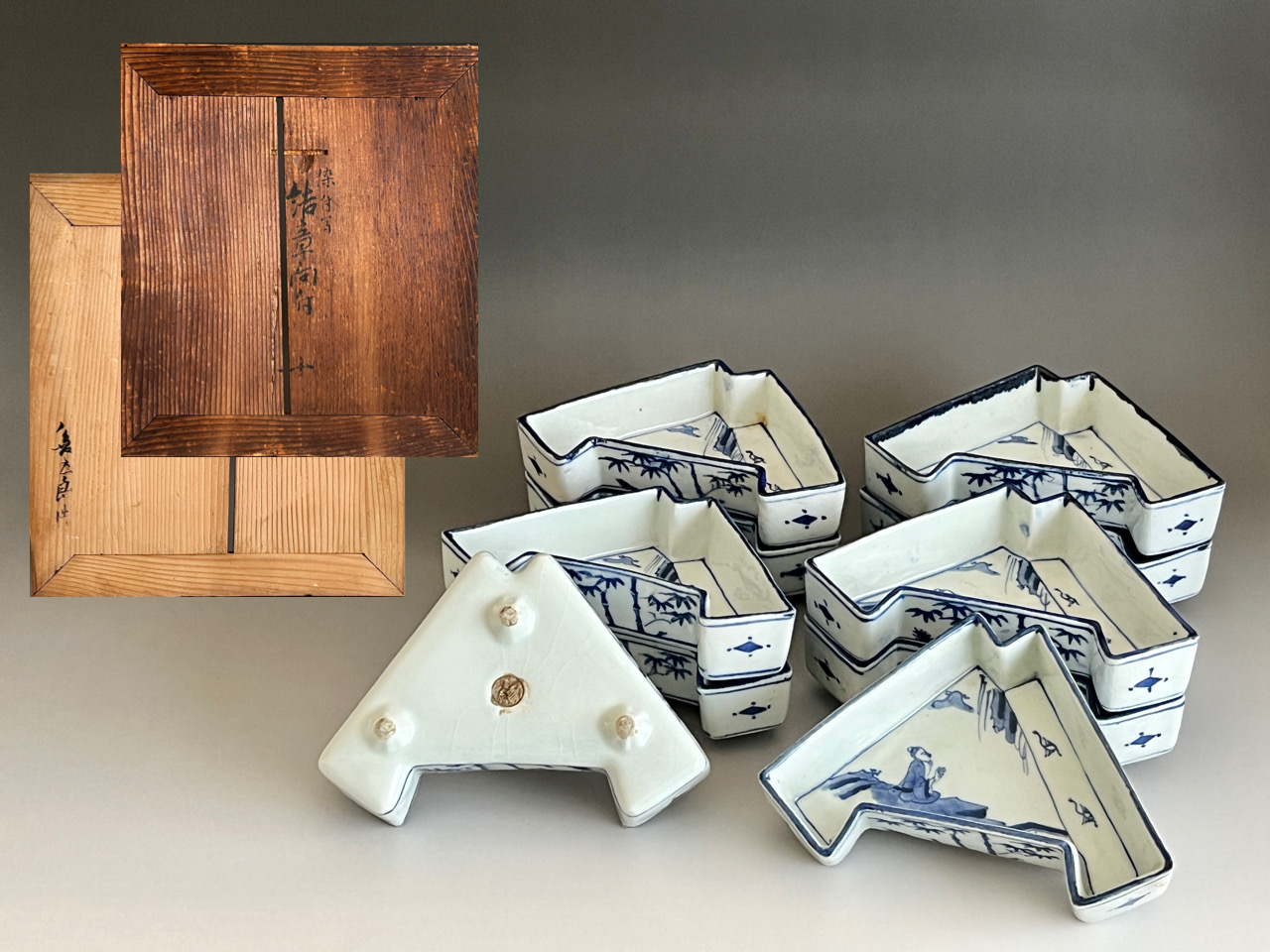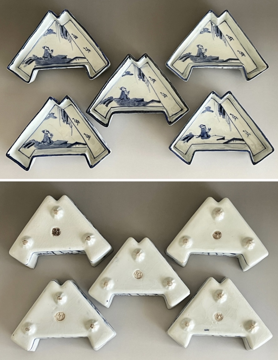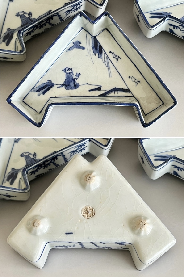 ⚫︎ 十一代 永楽善五郎 (保全) 河濱支流印 染付写 松竹梅紋 結章向付 十客 足付き銘々皿 懐石 会席 和食器の落款