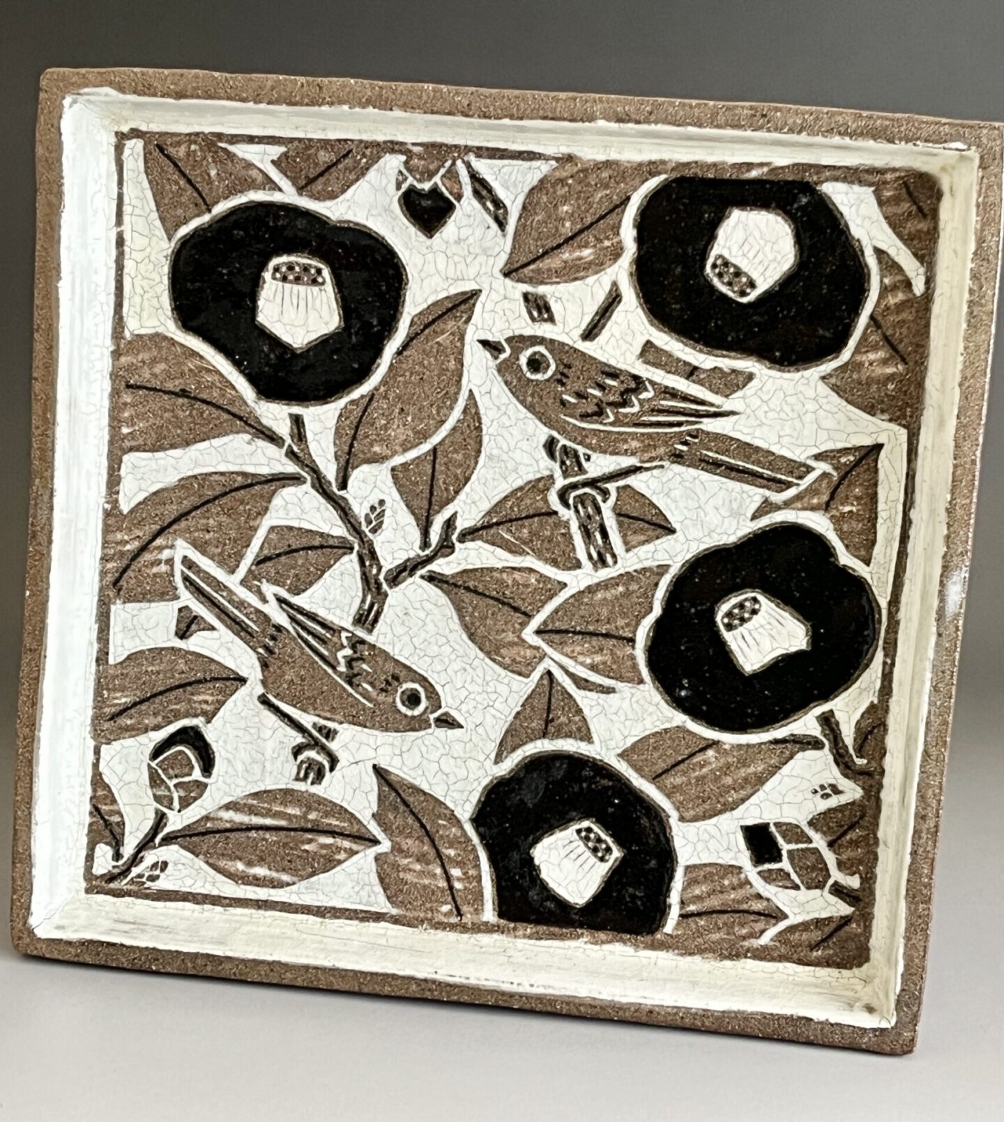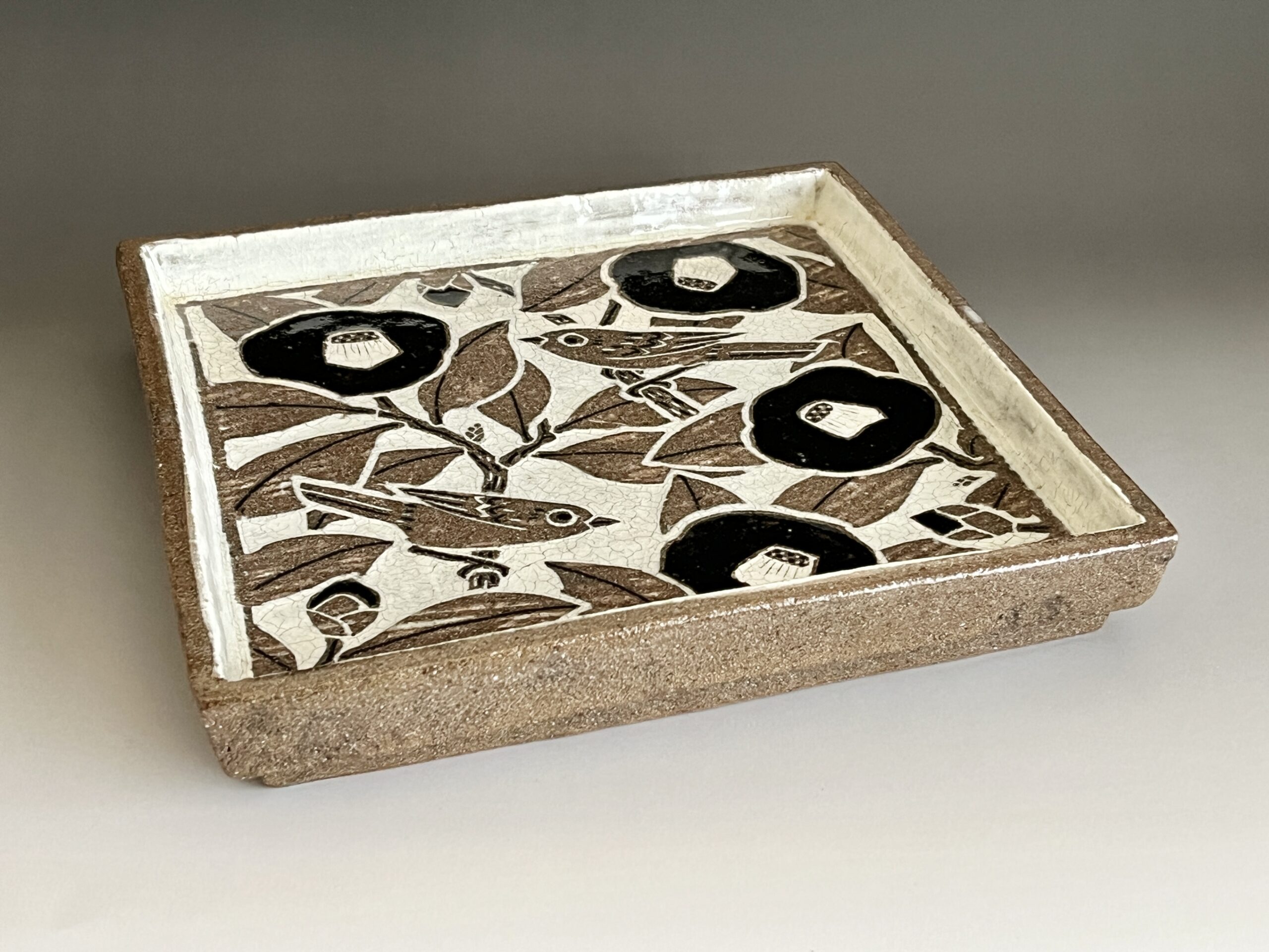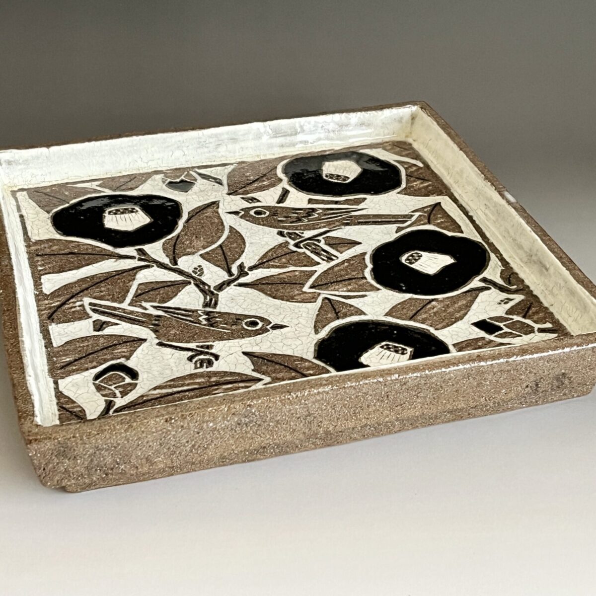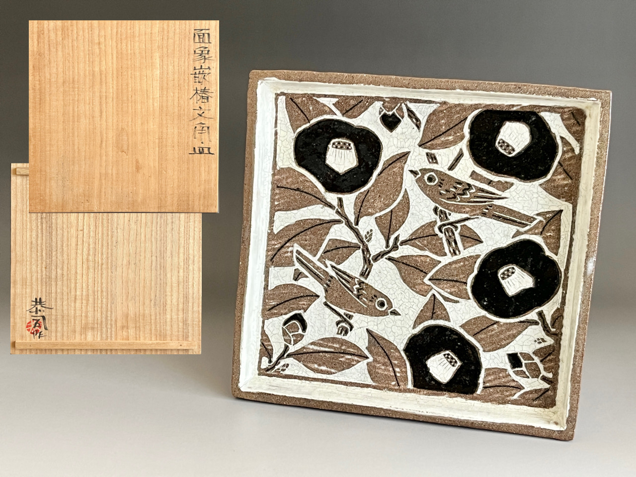 土居恭司 (師 人間国宝 田村耕一、浅野陽) 面象嵌 椿文角皿 花鳥文 飾り皿