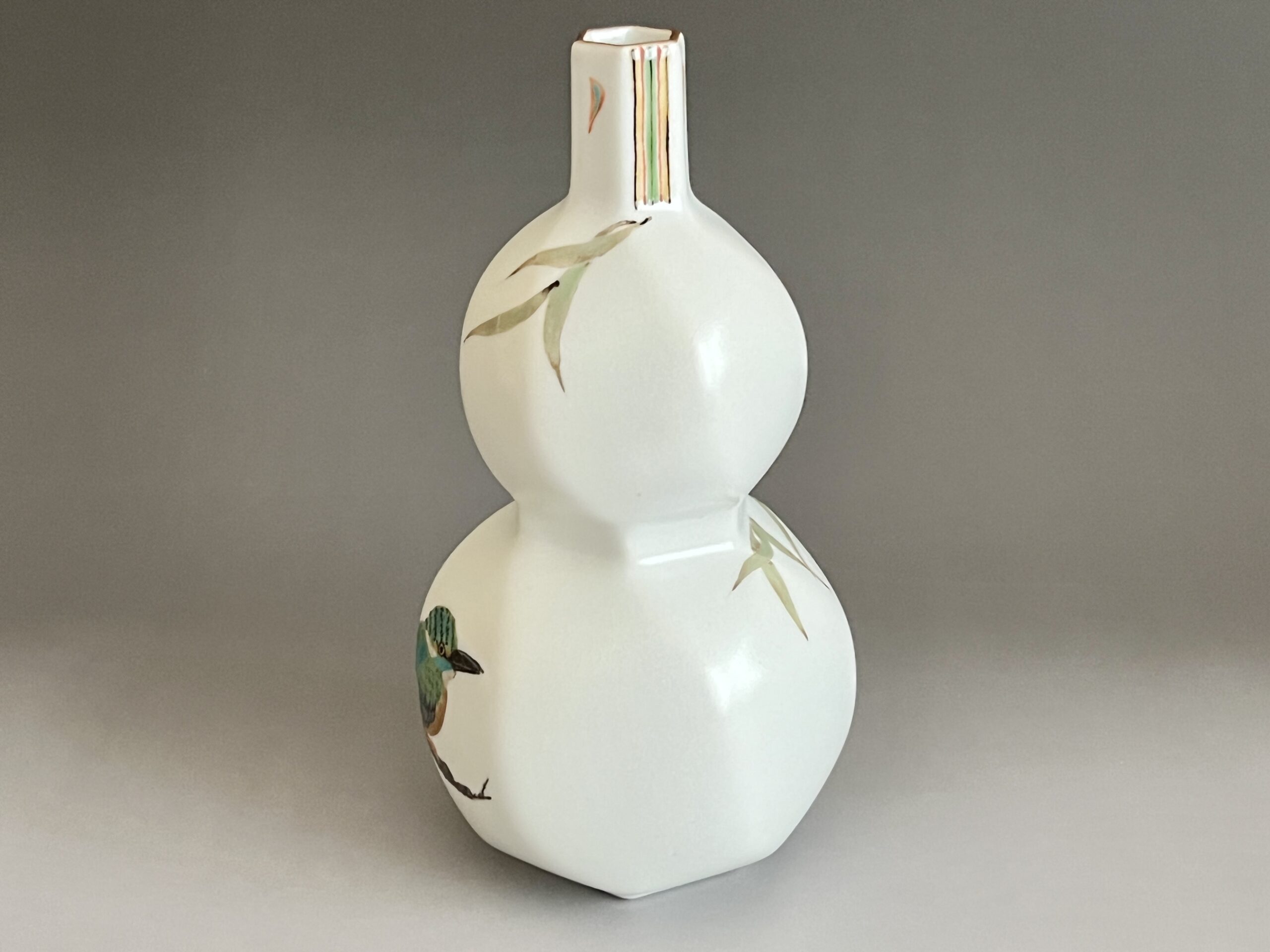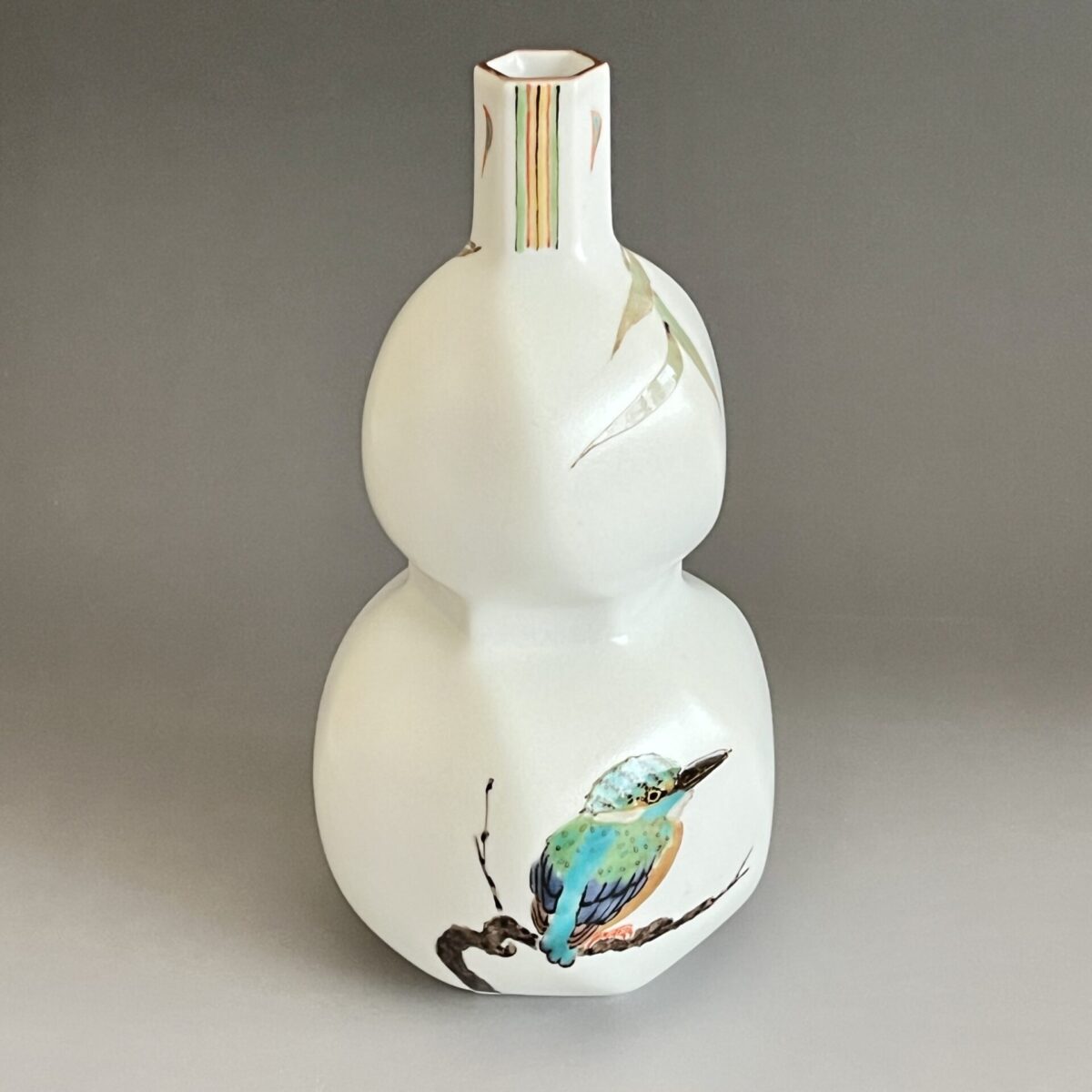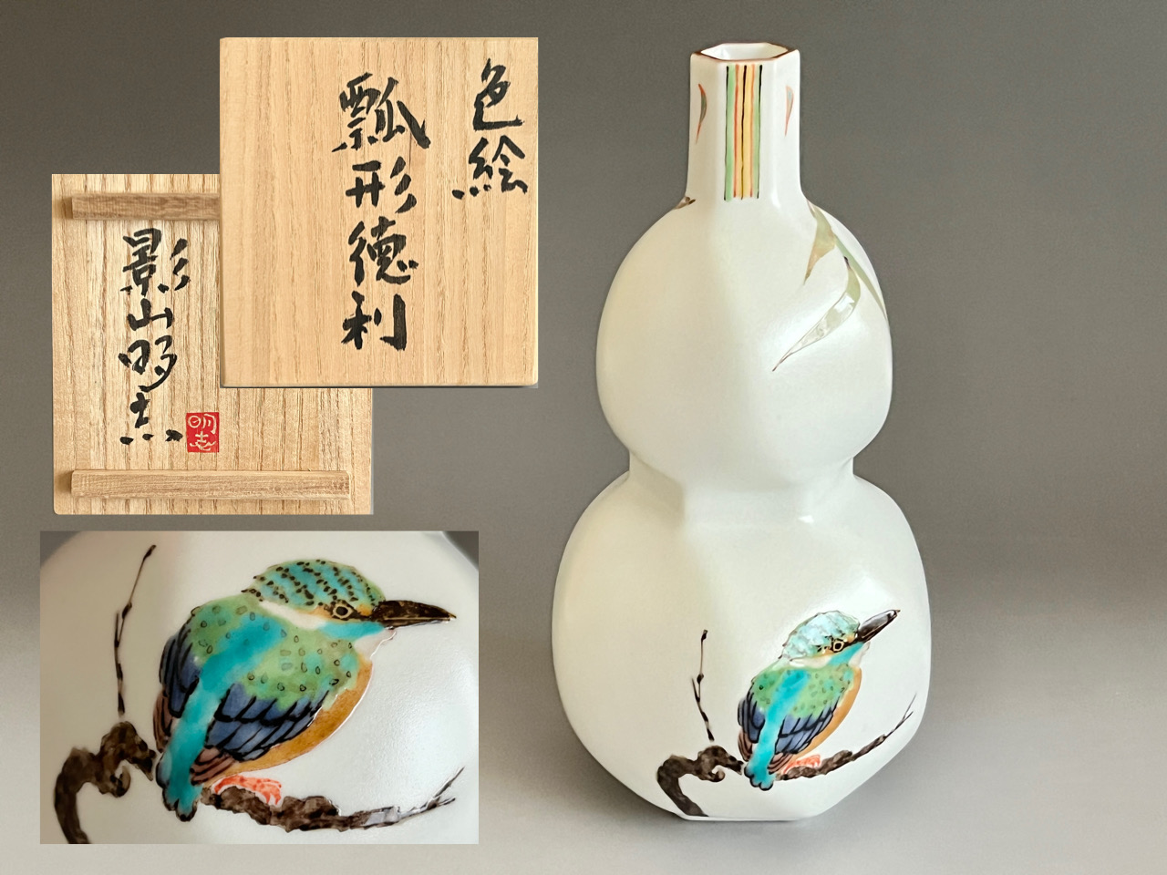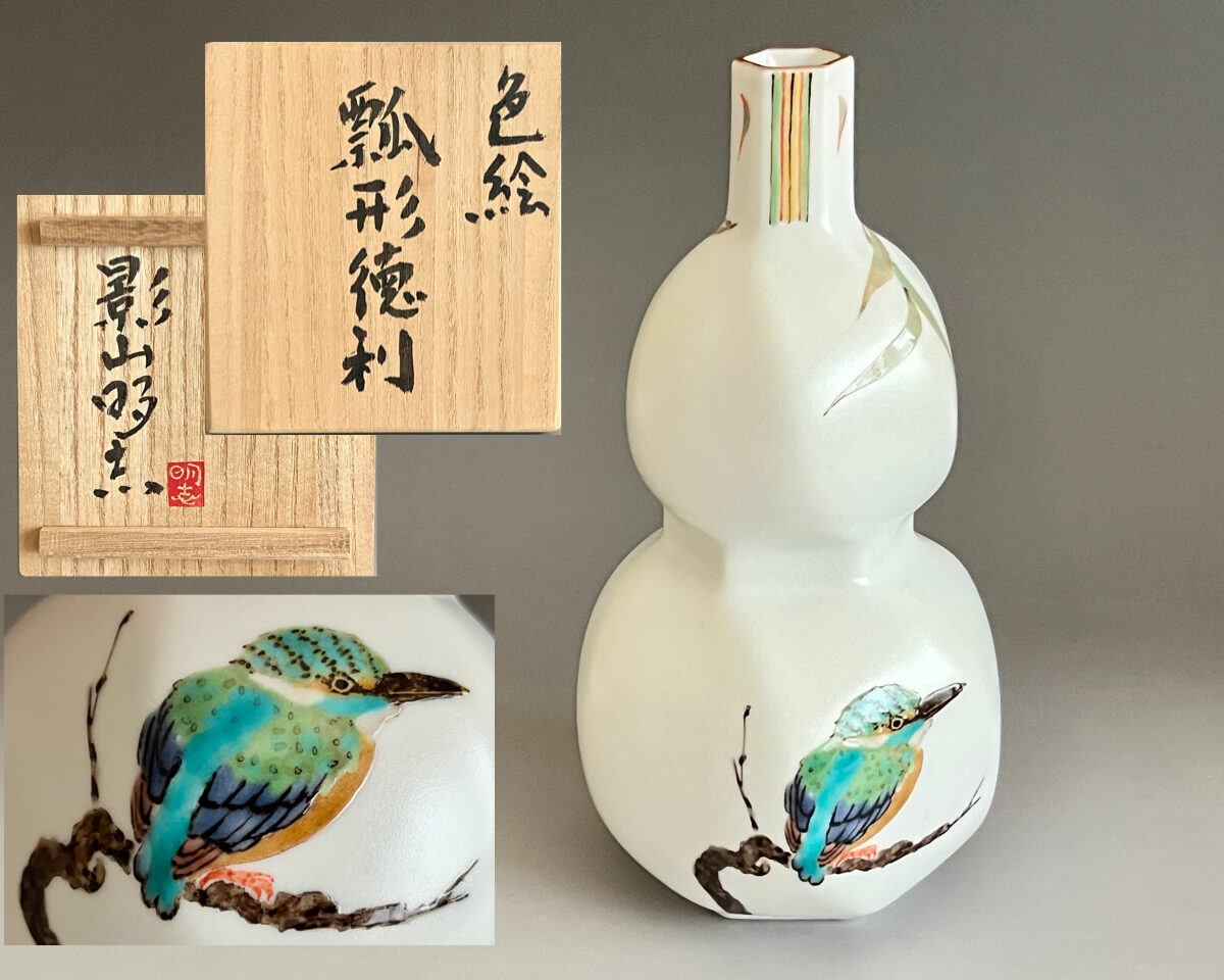 影山明志 (師 人間国宝 藤本能道) 色絵 翡翠図 瓢形徳利 カワセミ 酒器 ①
