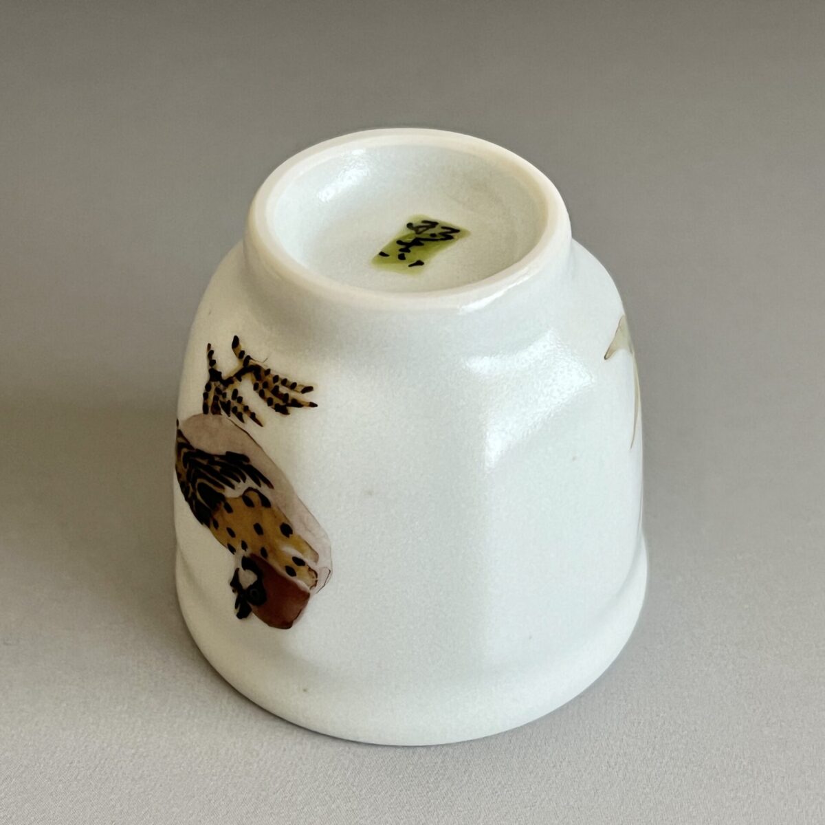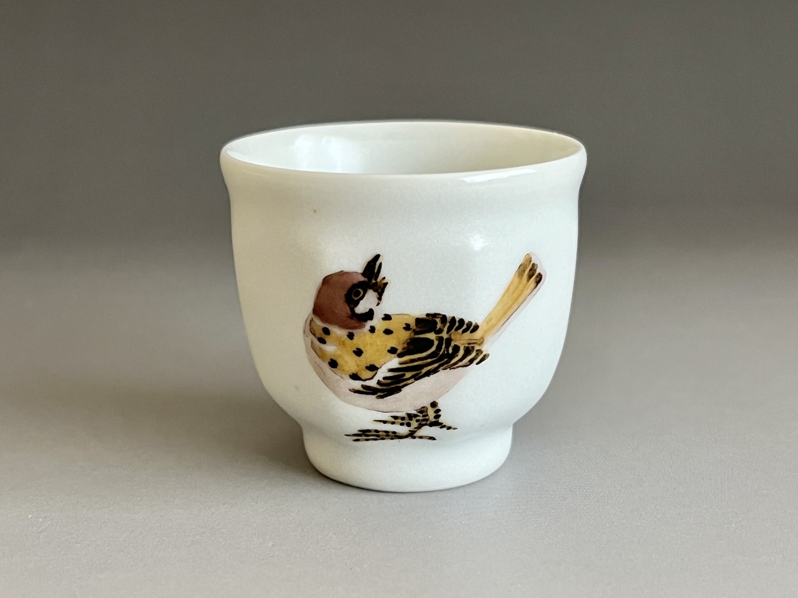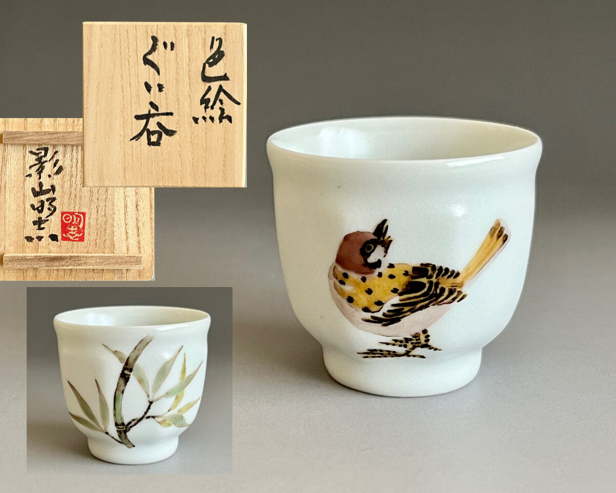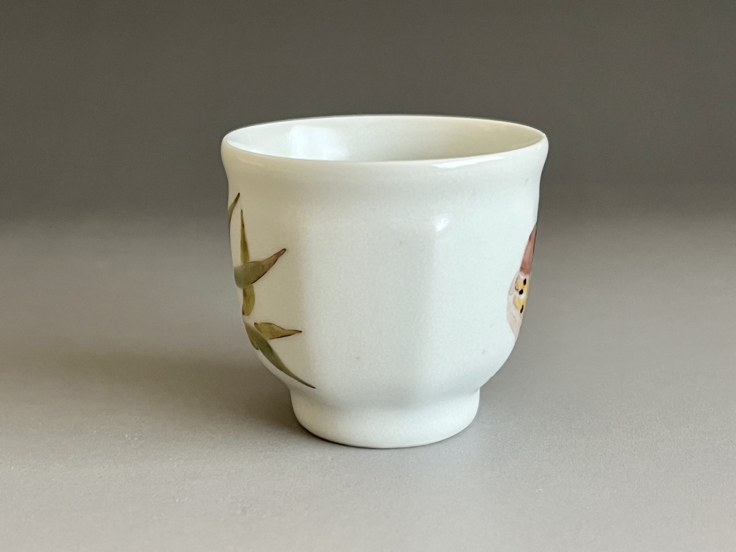 影山明志 (師 人間国宝 藤本能道) 色絵 竹雀紋 ぐい呑 酒盃 酒器 ②