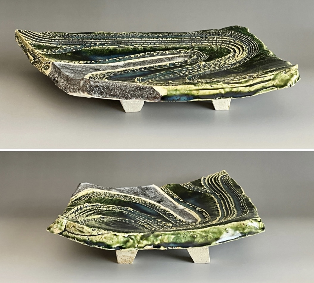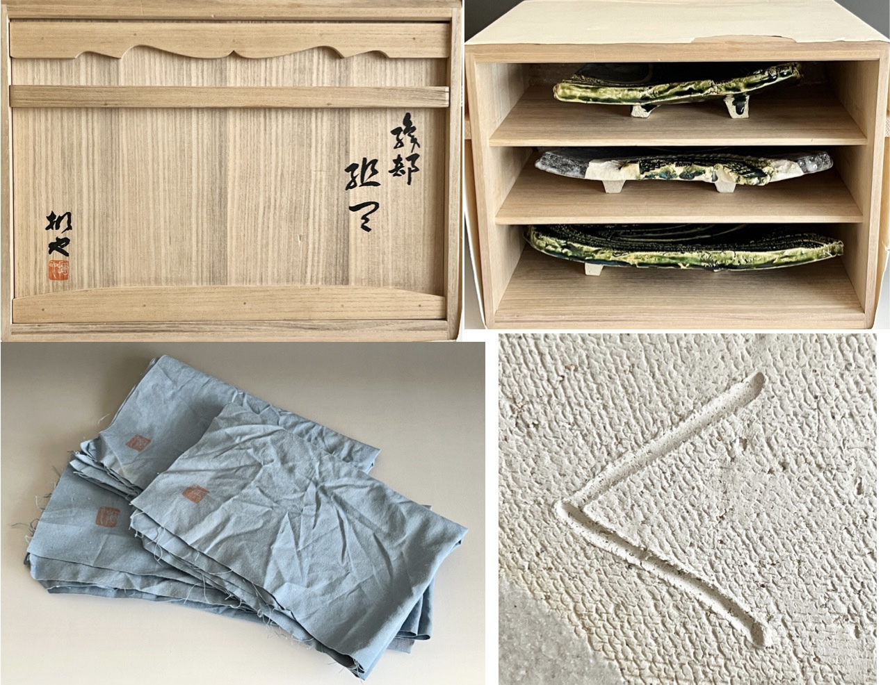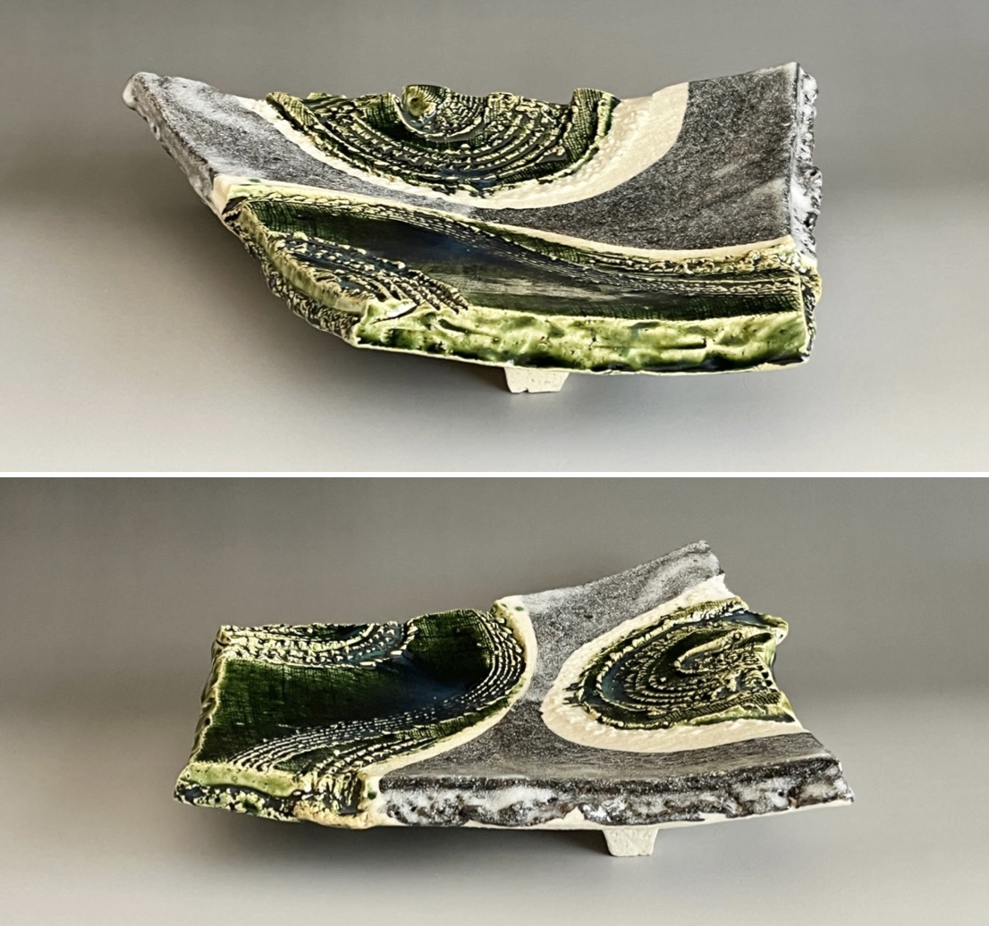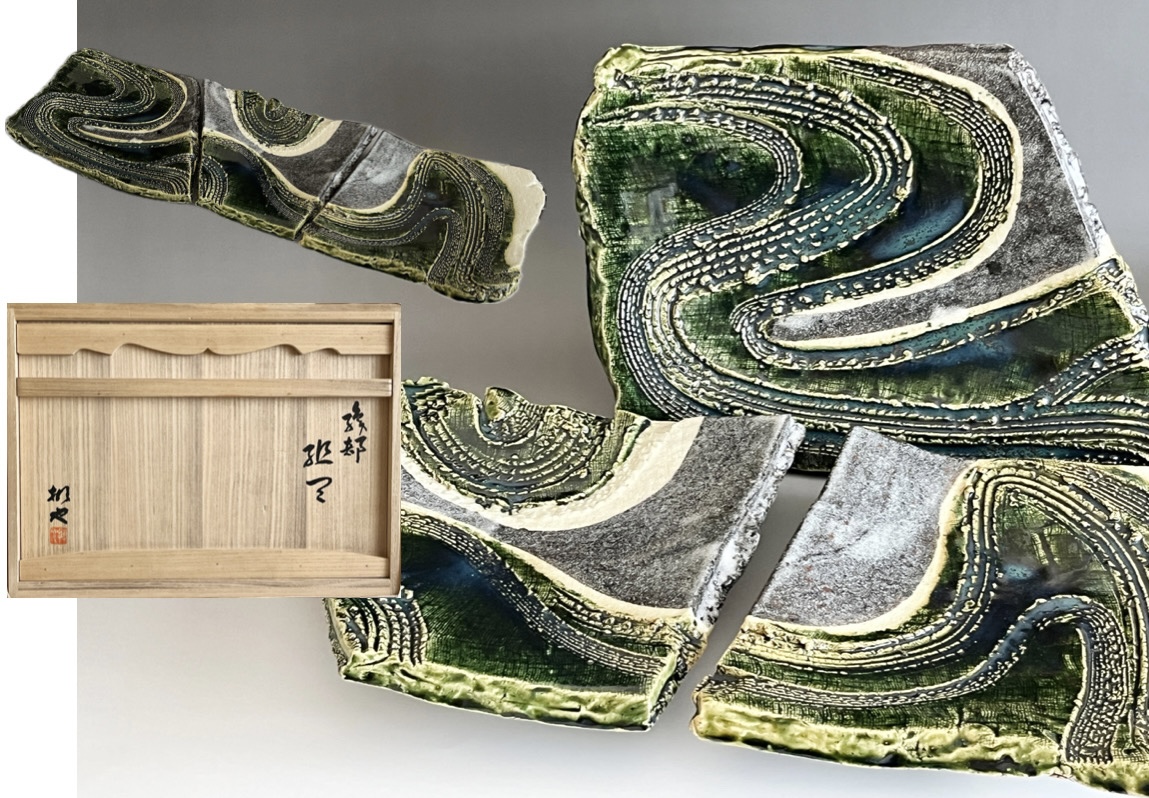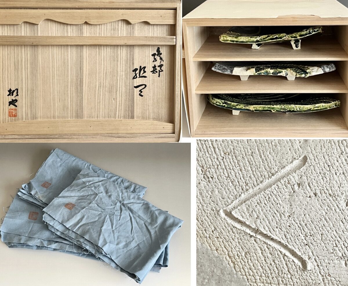 加藤掴也 (師 日根野作三) 織部 足付き組皿 流線文 変わり皿 三客 大皿 懐石 会席 和食器の落款
