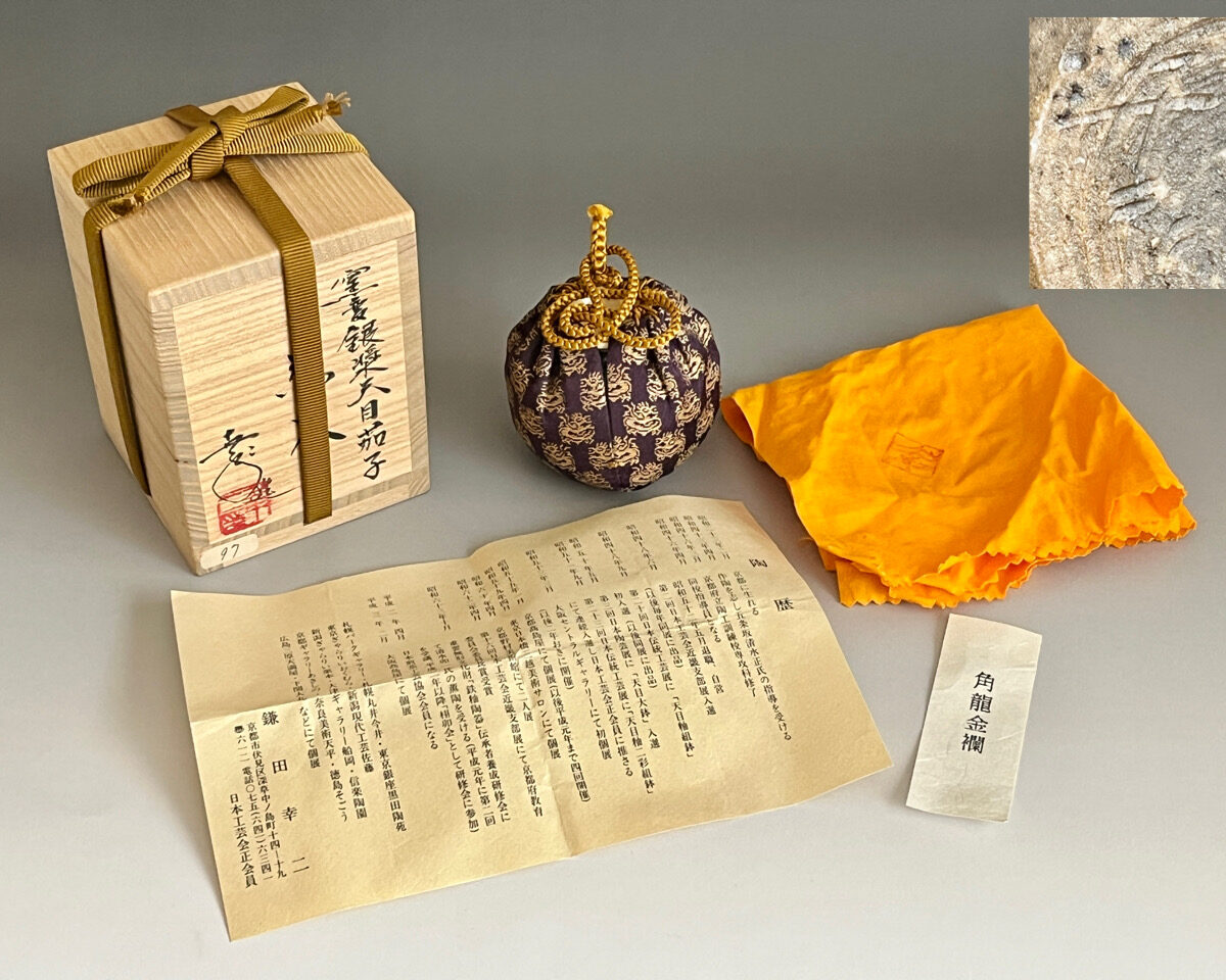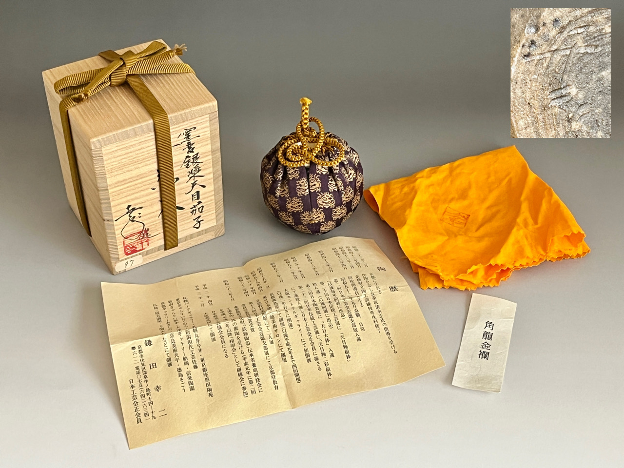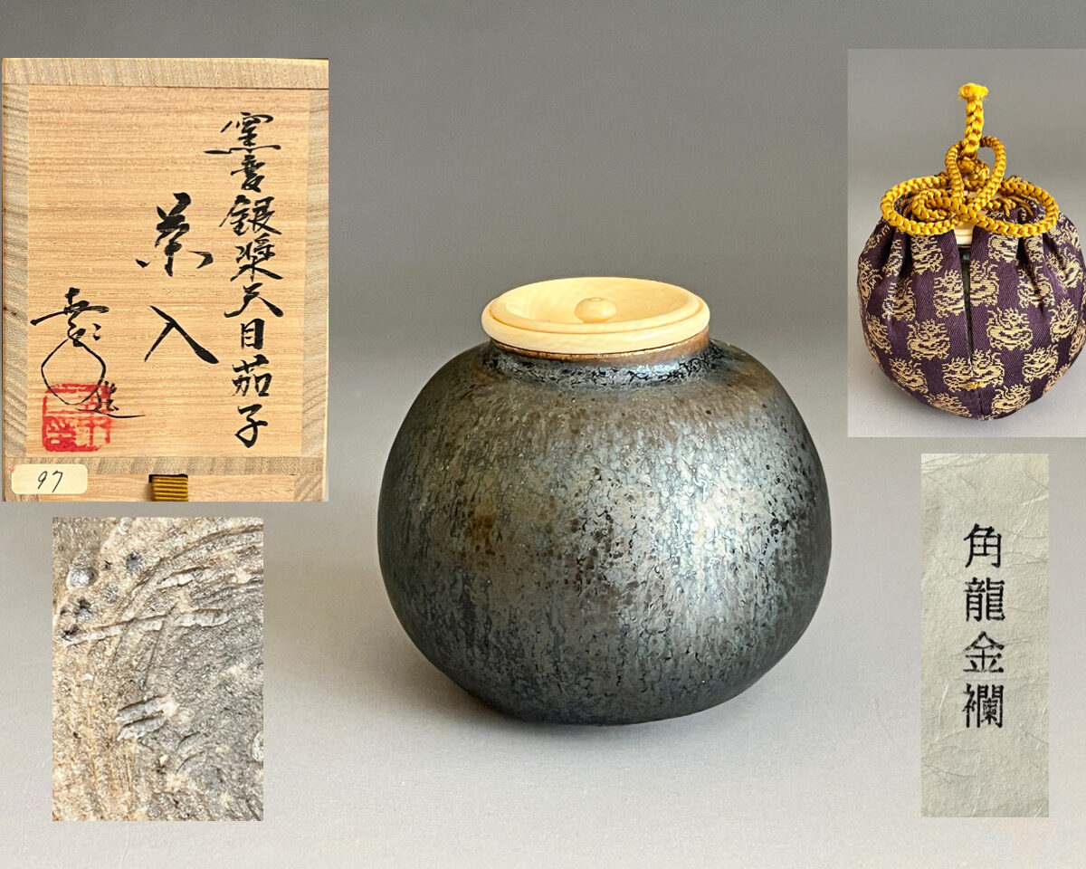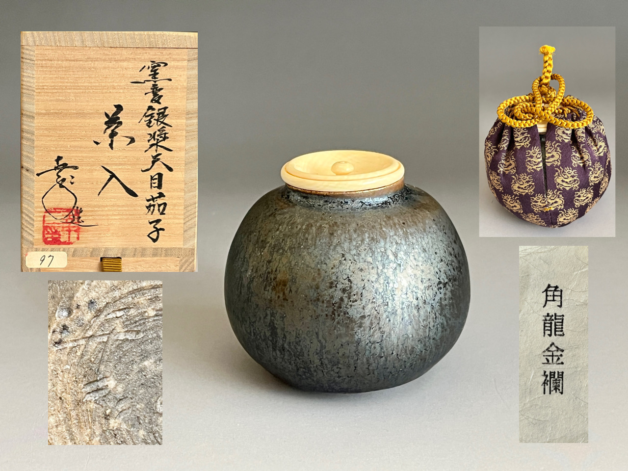 ★ 鎌田幸二 掻き銘 窯変 銀漿天目 茄子茶入 仕覆 角龍金襴 茶道具の陶印
