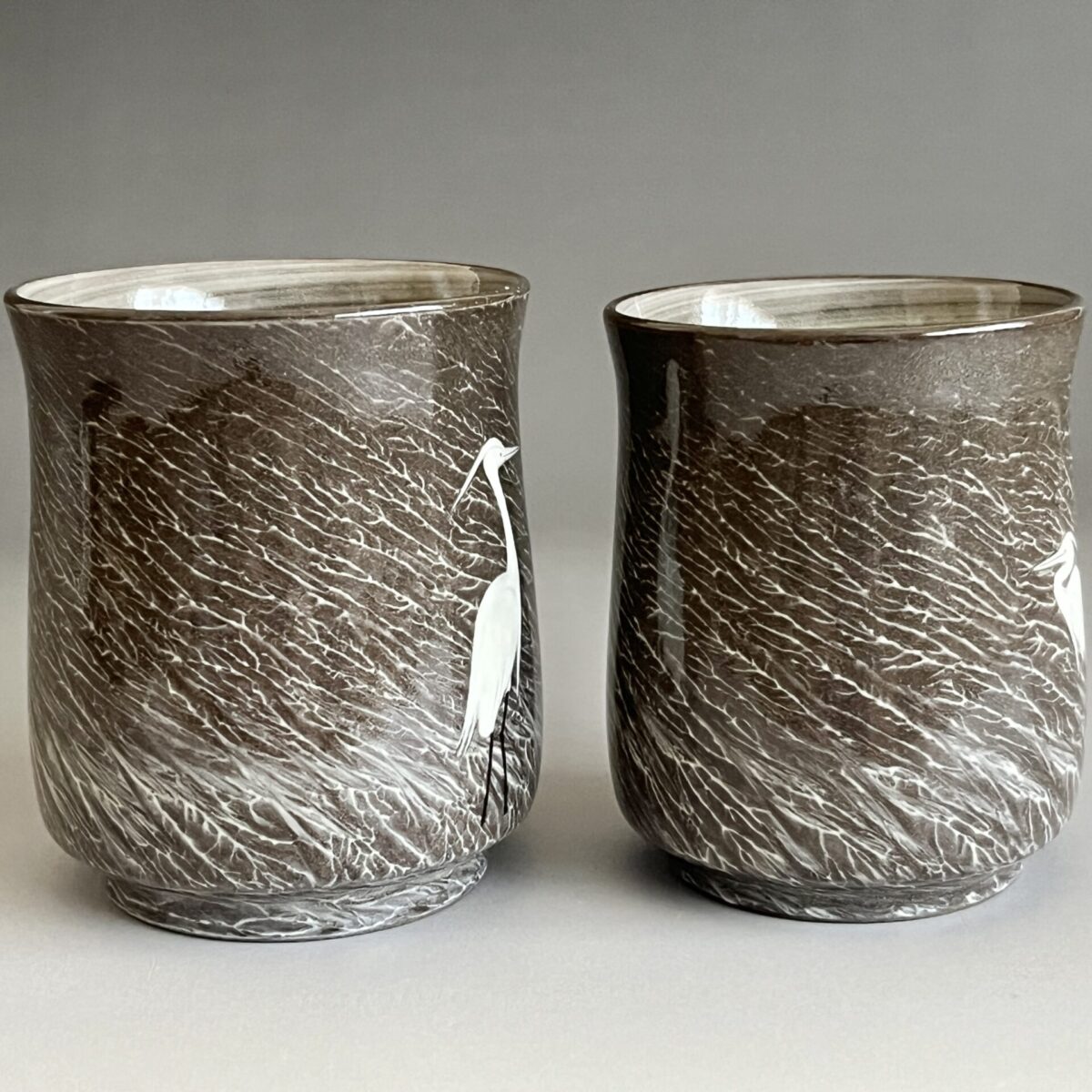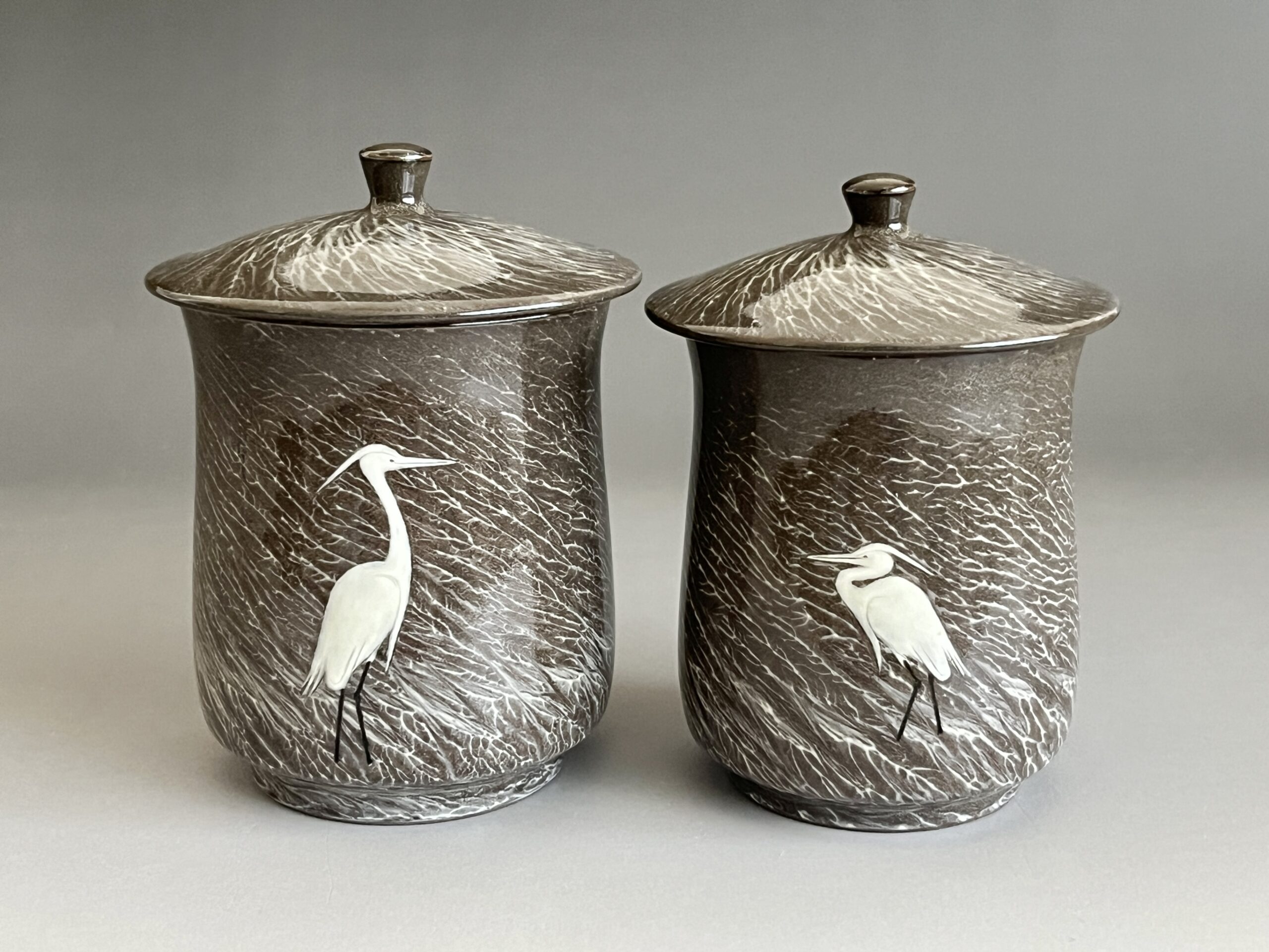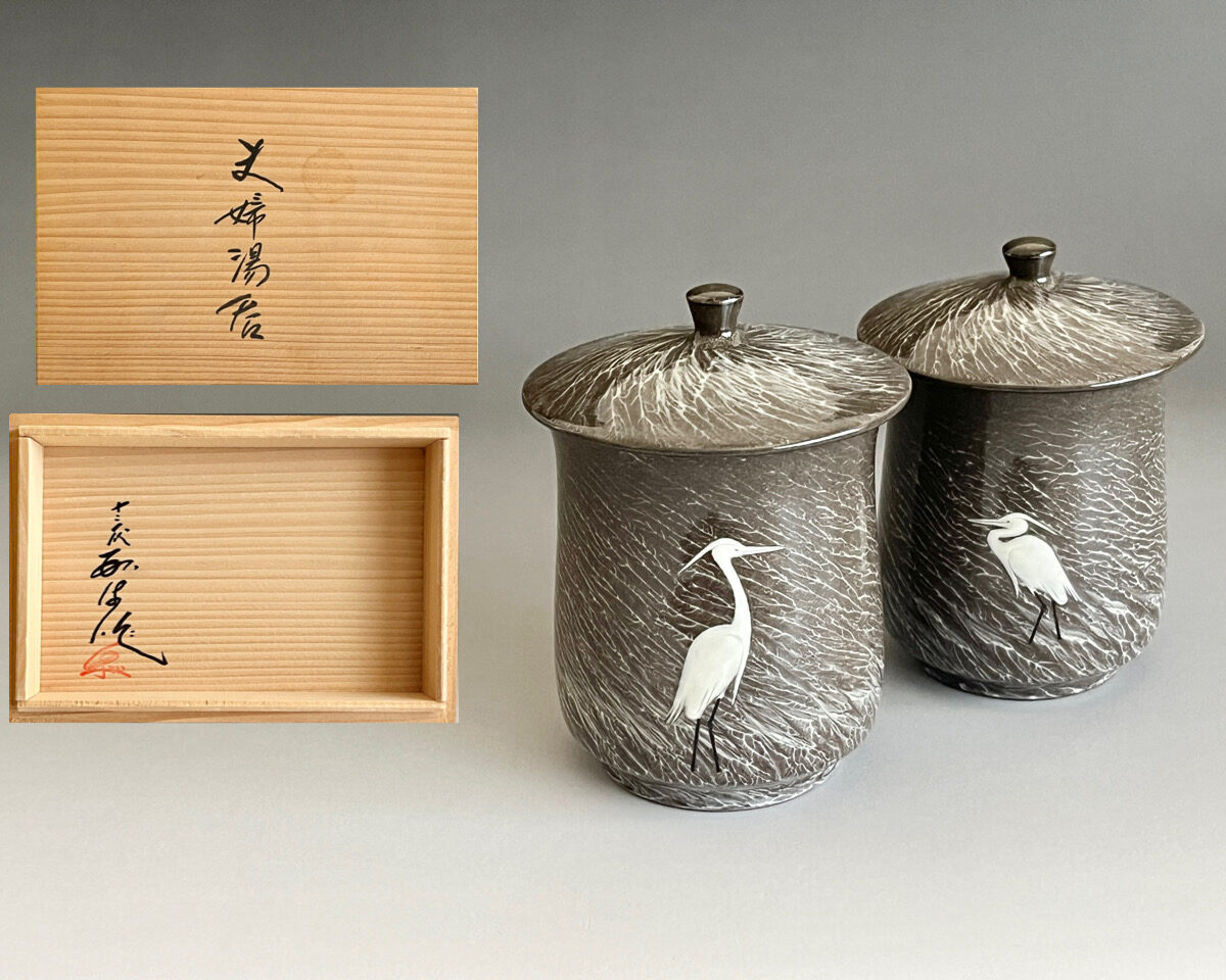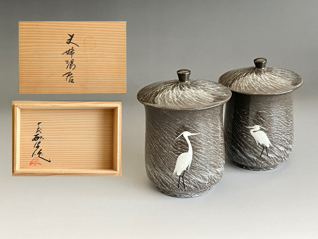 十三代 横石臥牛 現川焼 白鷺 夫婦蓋付湯呑 二客 湯碗の陶印
