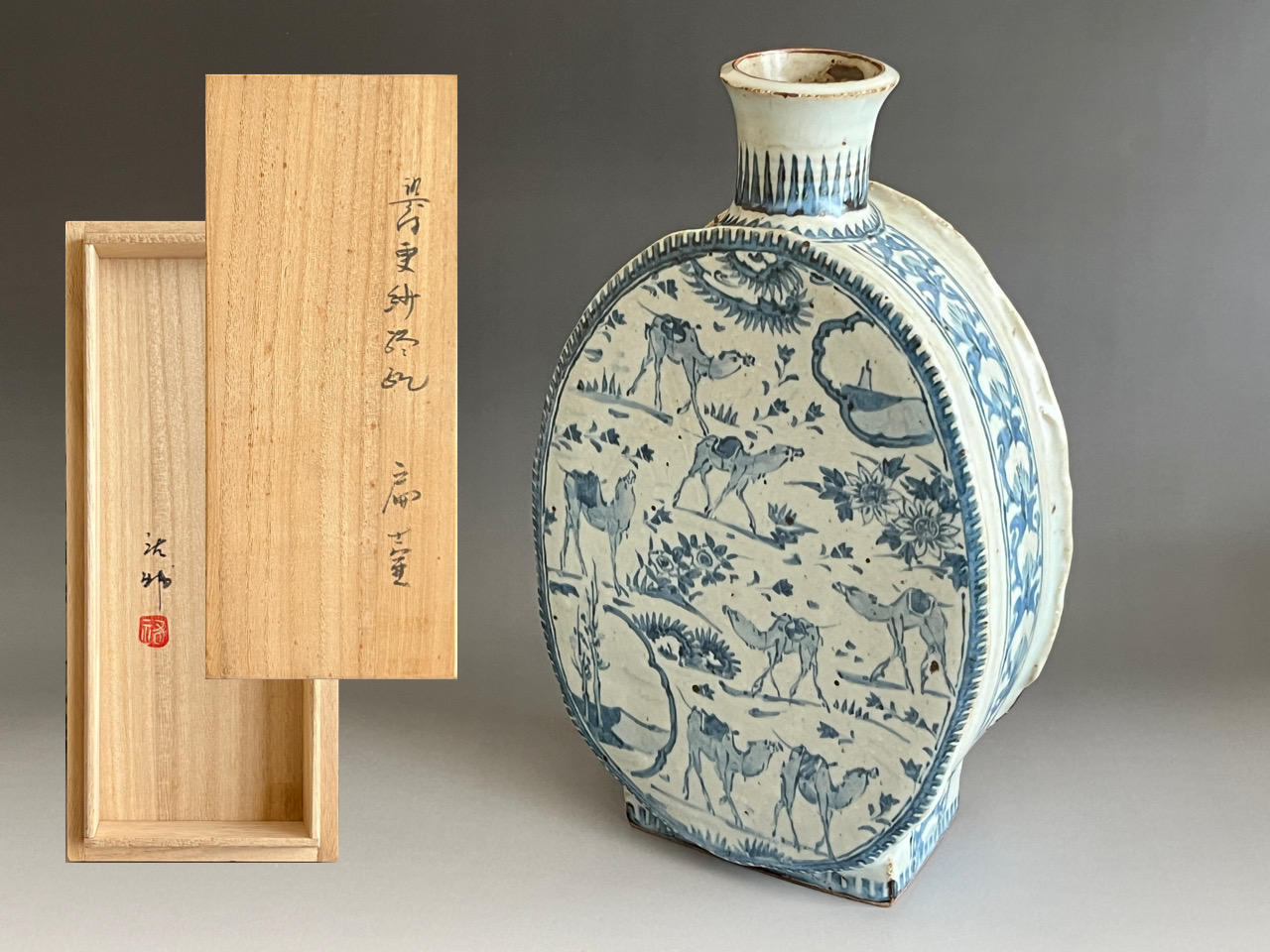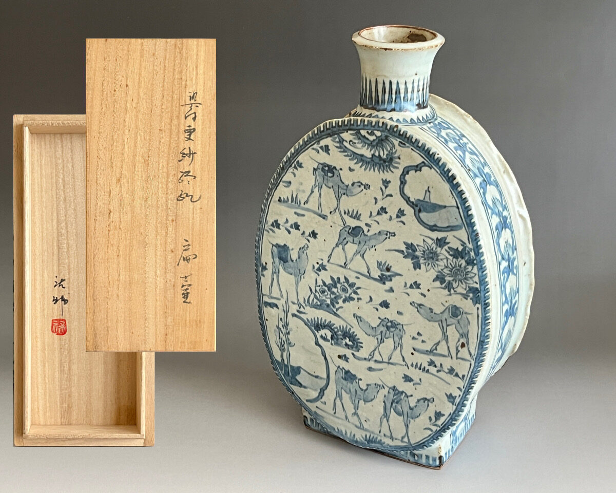 宮崎祐輔 染付 更紗駱駝 扁壷 高さ31.0㎝ 花入 花瓶 花器 茶道具