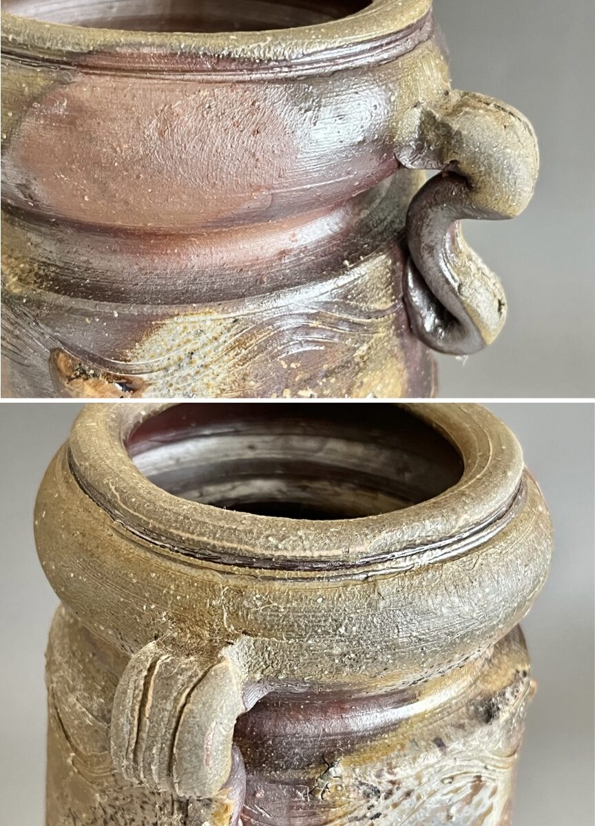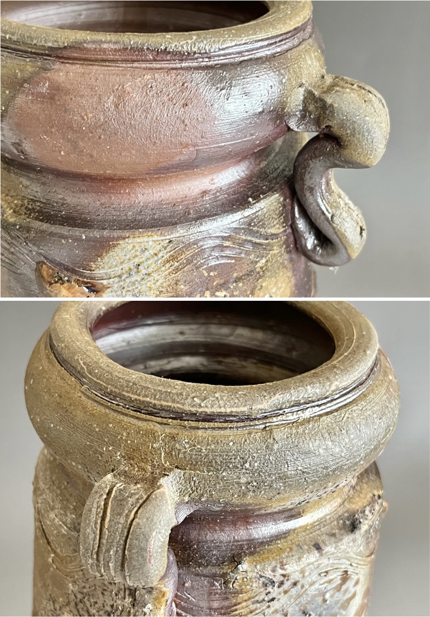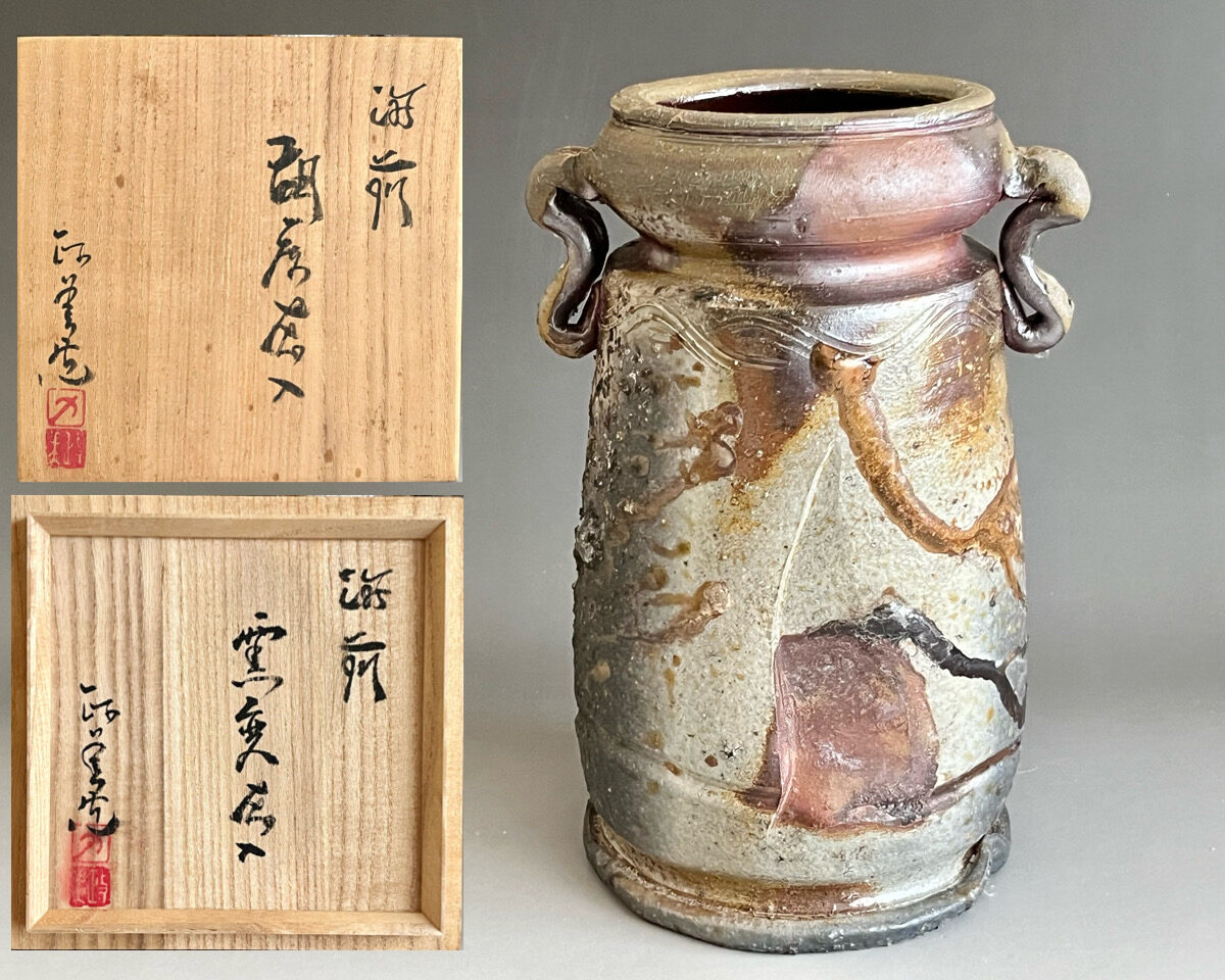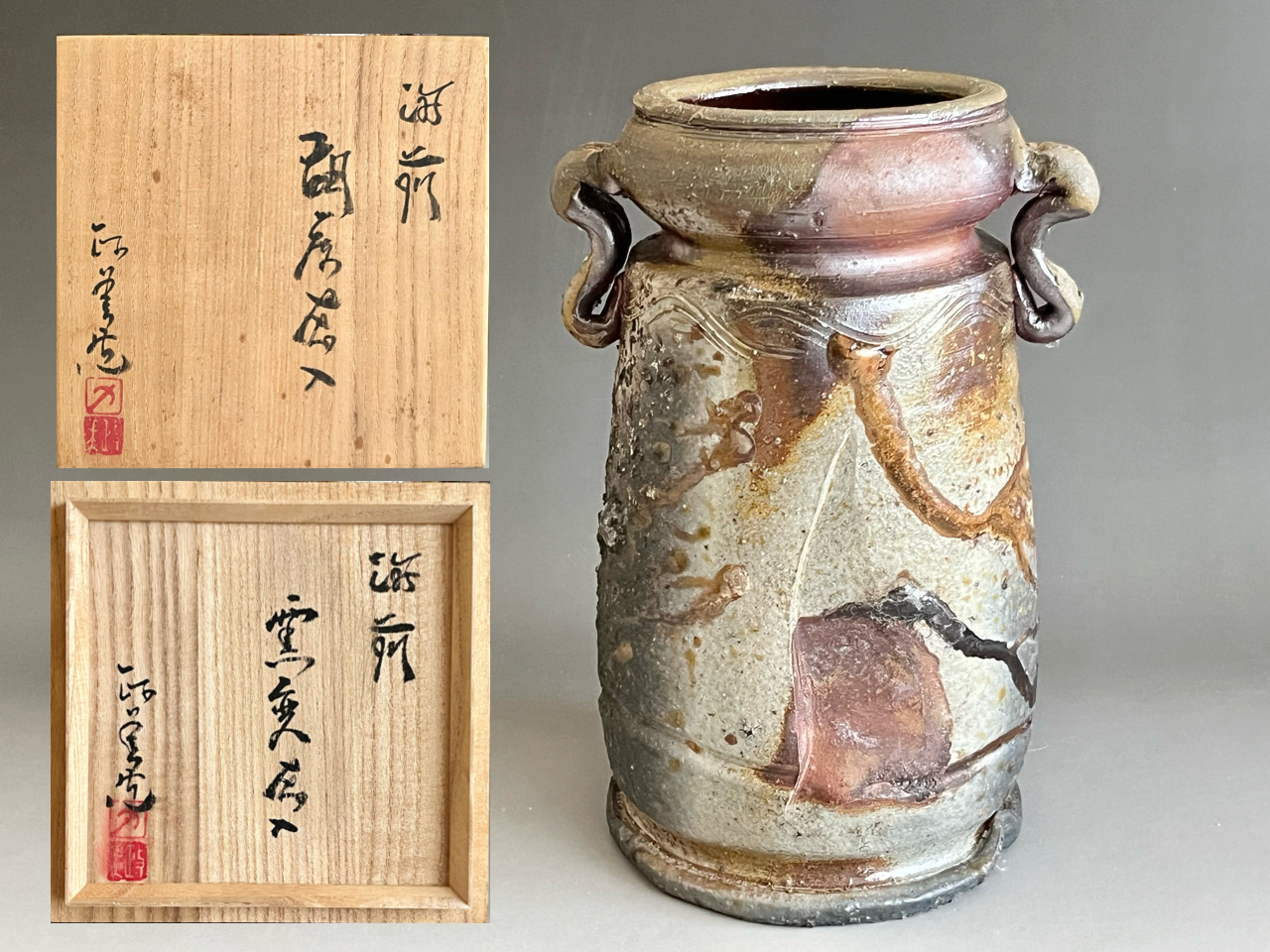 西川政美 (師 人間国宝 金重陶陽) 備前 窯変 胡麻 花入 耳付 花生 花瓶 花器 茶道具