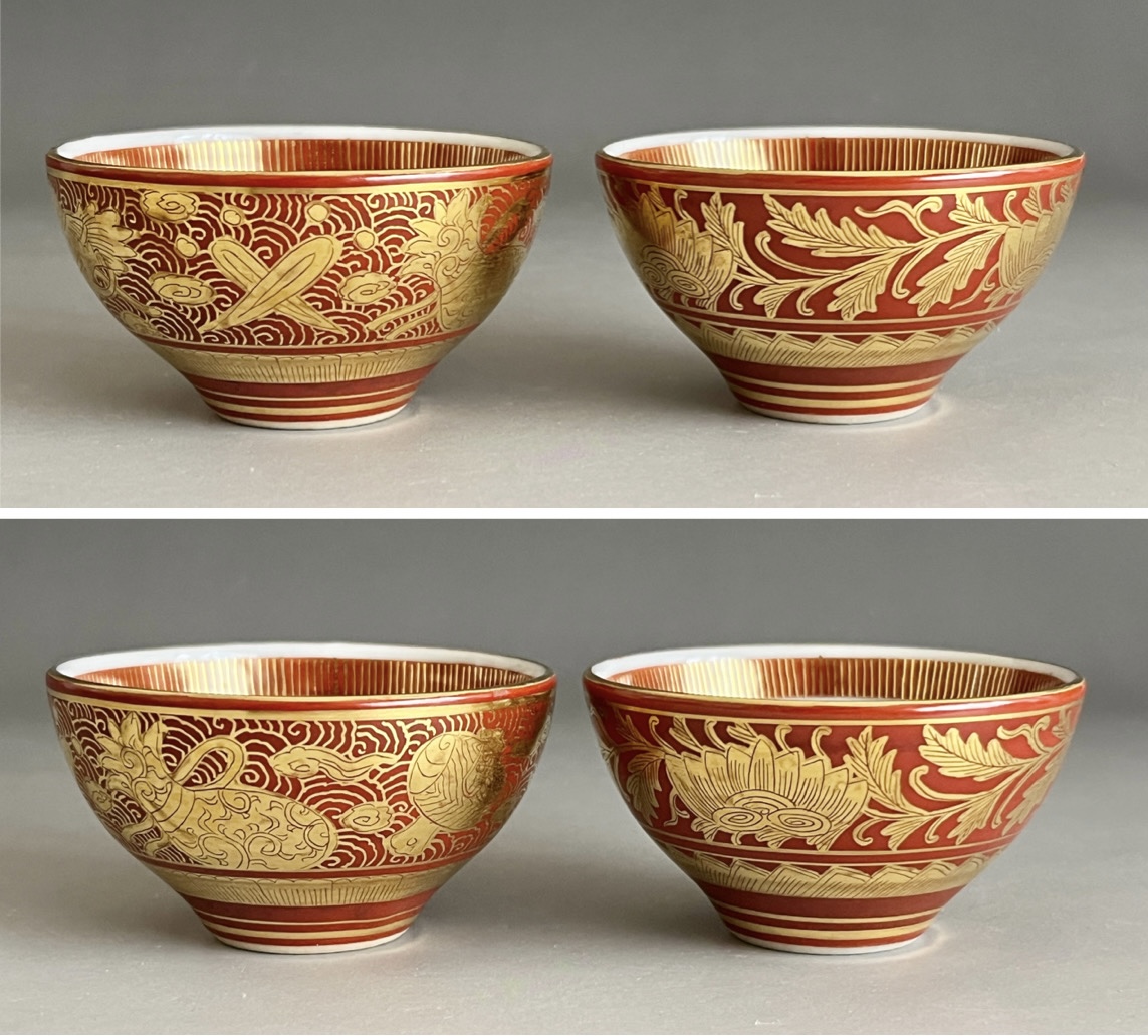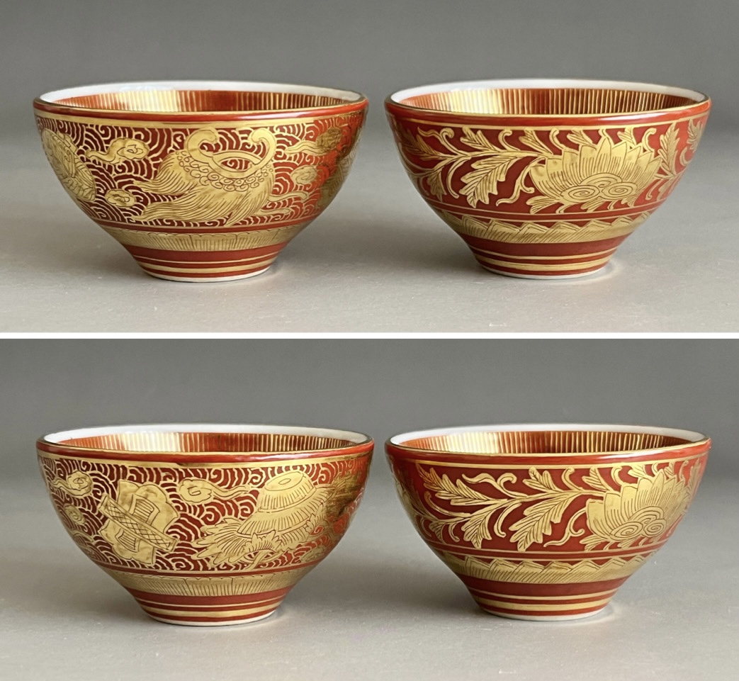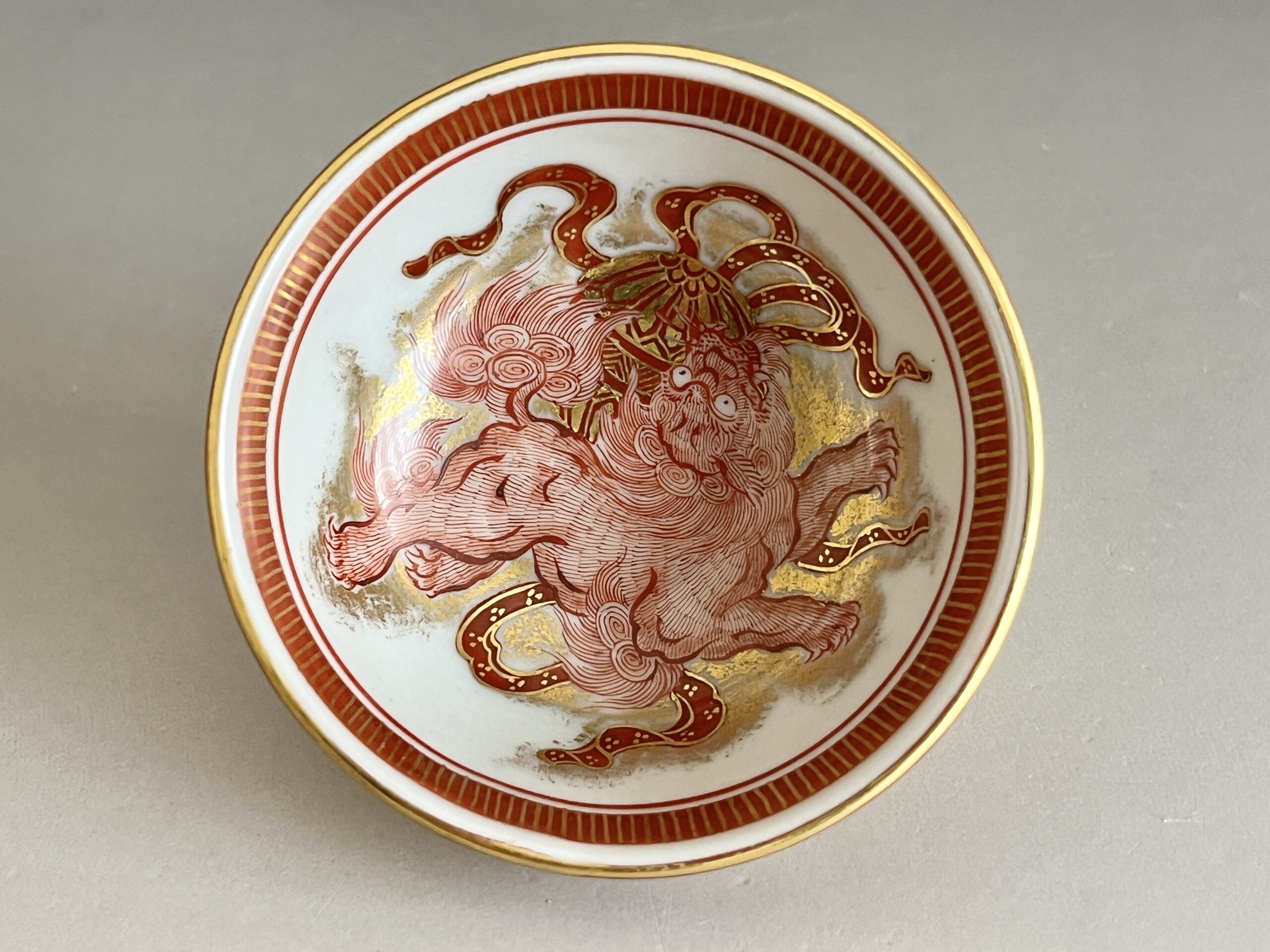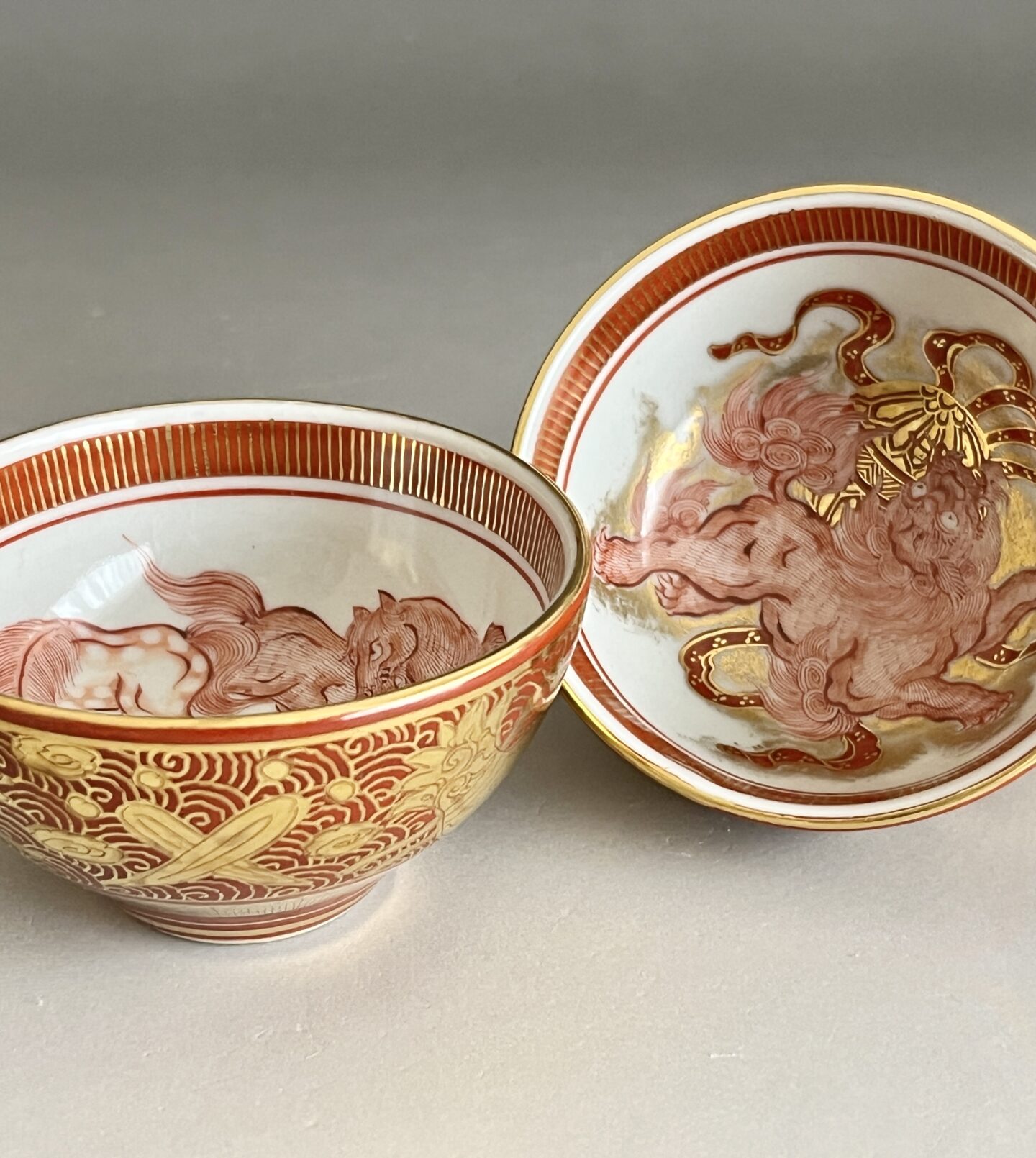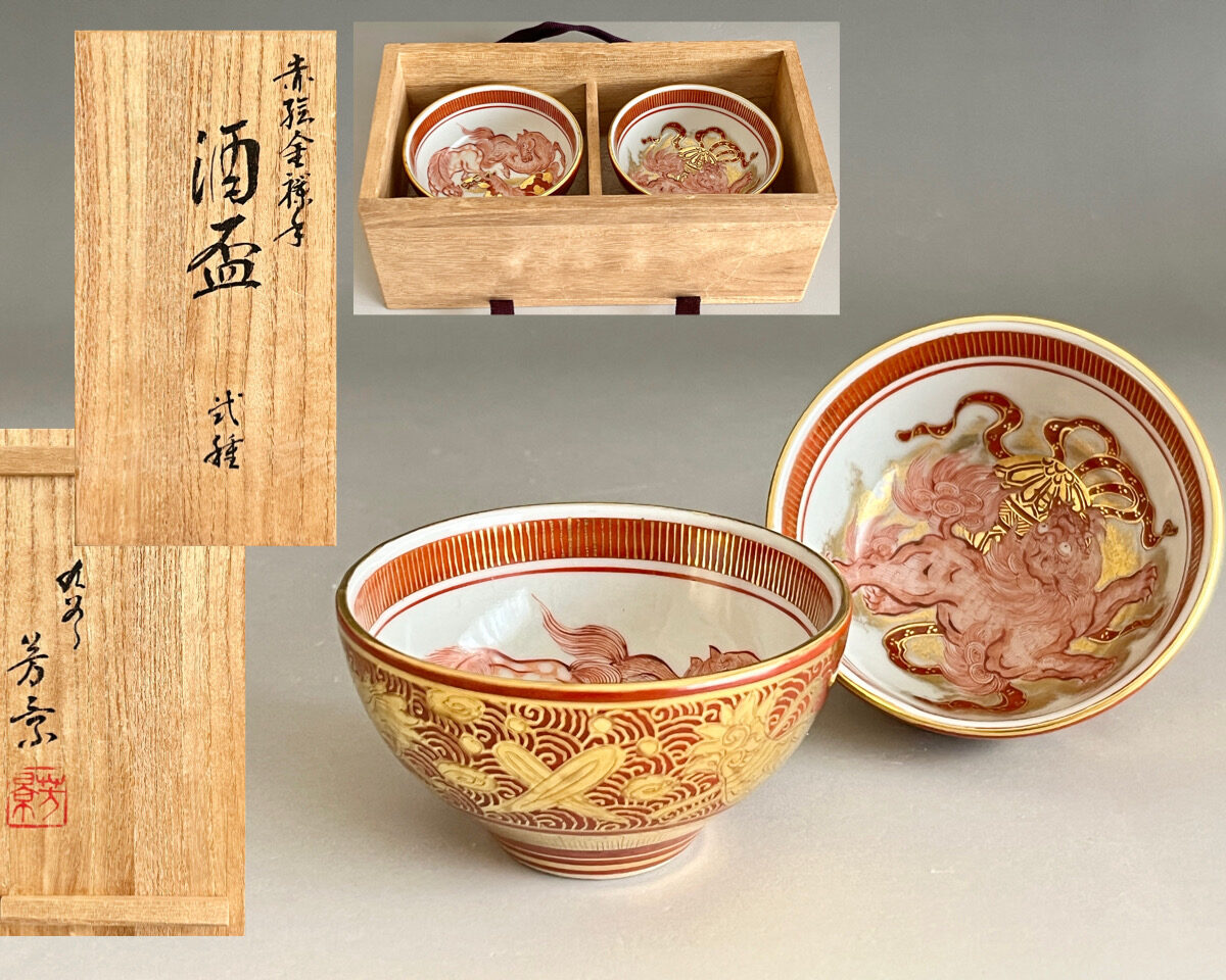 ⚫︎ 相上芳景 九谷焼 赤絵 金襴手 酒盃 一対 馬 獅子 ぐい呑 酒器 二客